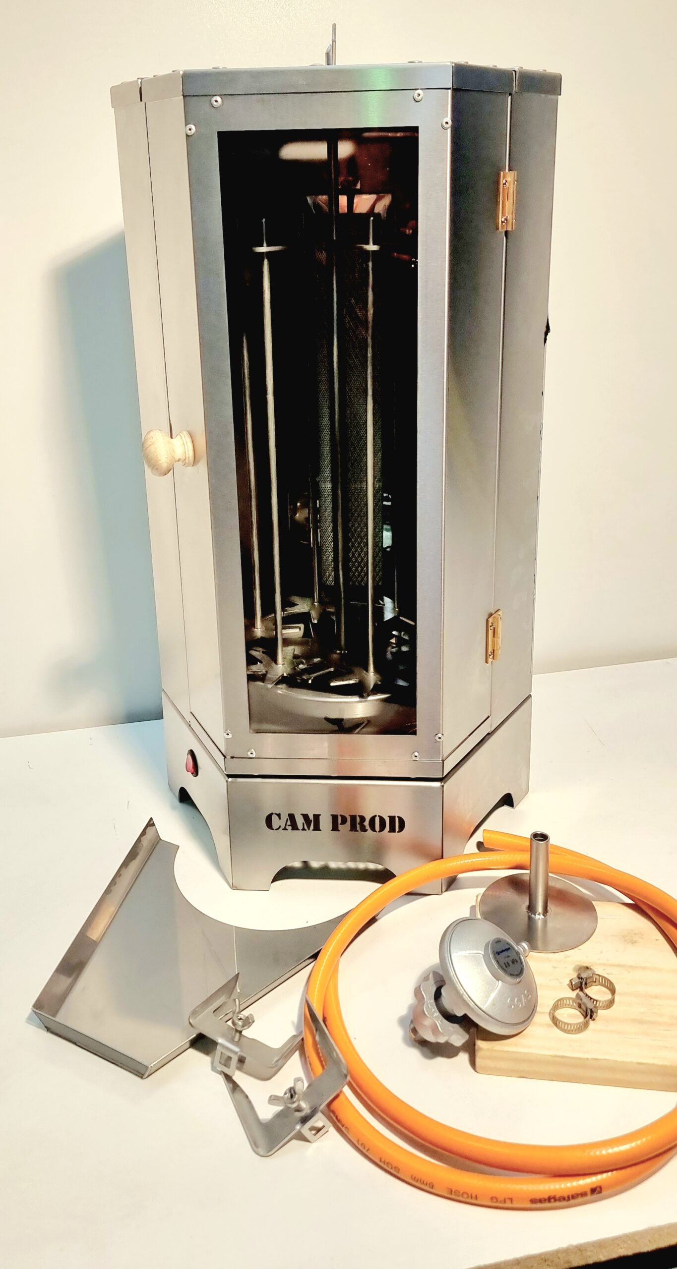 Vertical Spit 3-in-1: Espetada | Shawarma | Roast – Cook perfect meats with 6 stainless-steel skewers, sturdy prongs, and a special sauce spacer. Made from 1.2mm stainless steel, runs on gas or batteries, with a tempered glass door and easy-clean design. Portable, durable, and ideal for home or professional use.